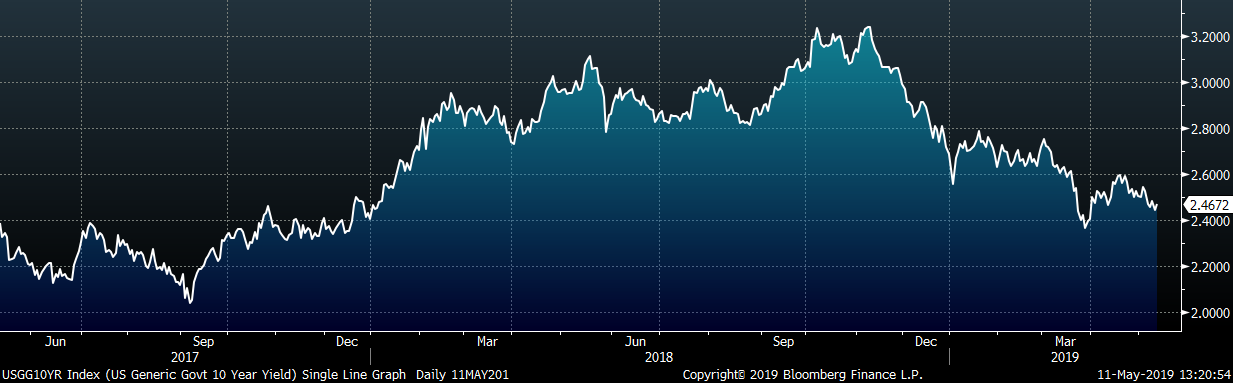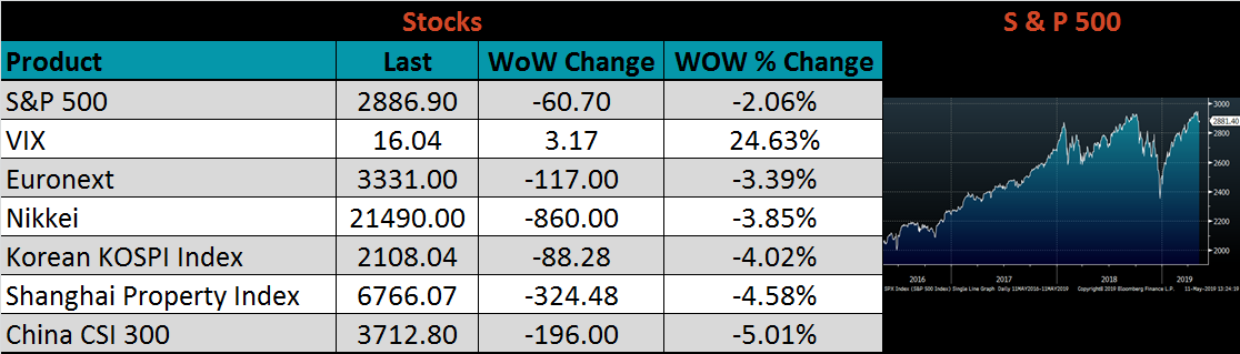The U.S. 10-year treasury yield was down six basis points, closing the week at 2.47%. The Japanese 10-year yield was down to -0.05%. The German 10-year yield was down seven basis points and went back into negative territory closing at -0.05%.