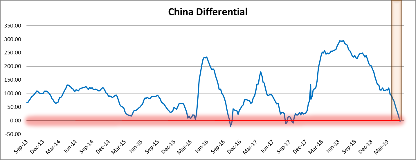 Last week’s report began to look at where the current price downtrend might find a bottom. While we do not believe prices have reached the bottom yet, we will continue to look for indicators in the market that signal where it may be. One indicator that we track and have been focused on recently is the China export price differential. Each week we include a section in this report (below) analyzing the Midwest price differential vs. export prices from around the world. This week in that section, we have updated the analysis to include tariff and transportation costs in the export price to better compare to the domestic price.