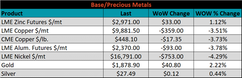 SBB Platt’s HRC, CRC and HDG pricing is below. The Midwest HDG, HRC & CRC prices were up, 2.8%, 2.6% and 2.6%, respectively. Globally, the Turkish export HRC price was up 6.1%.