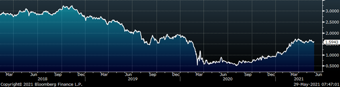 Last week, the July WTI crude oil future was up $2.74 or 4.3% to $66.32/bbl. The aggregate inventory level was down another 0.8%, while crude oil production remains at 11m bbl/day. The Baker Hughes North American rig count was up 6 rigs, and the U.S. rig count was up 2 rigs.
