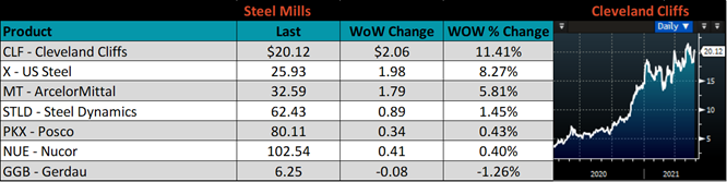 The CME Midwest HRC futures curve is below with last Friday’s settlements in white. Last week, the entire curve shifted higher, with the front month (June) settling at an all-time high, while the back of the curve continues to lag, $200 below the highs established at the same time.