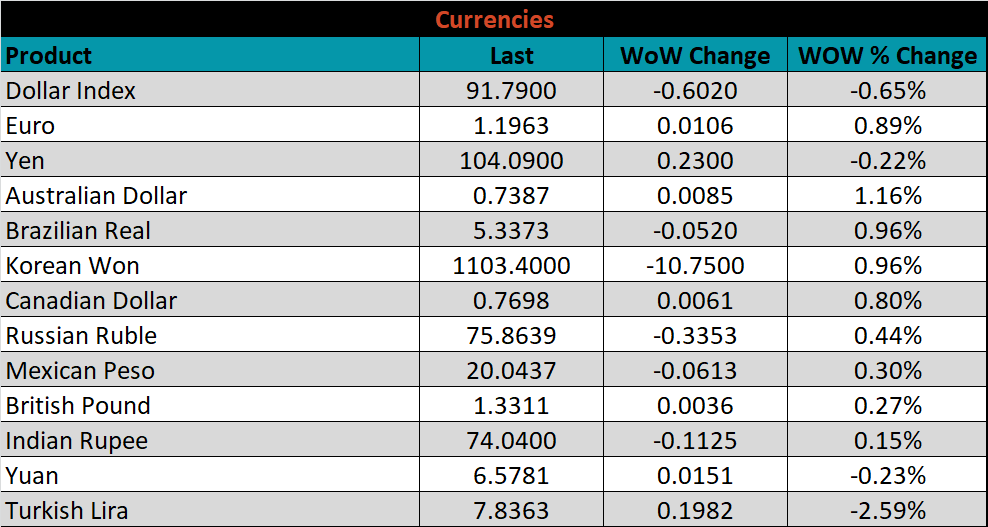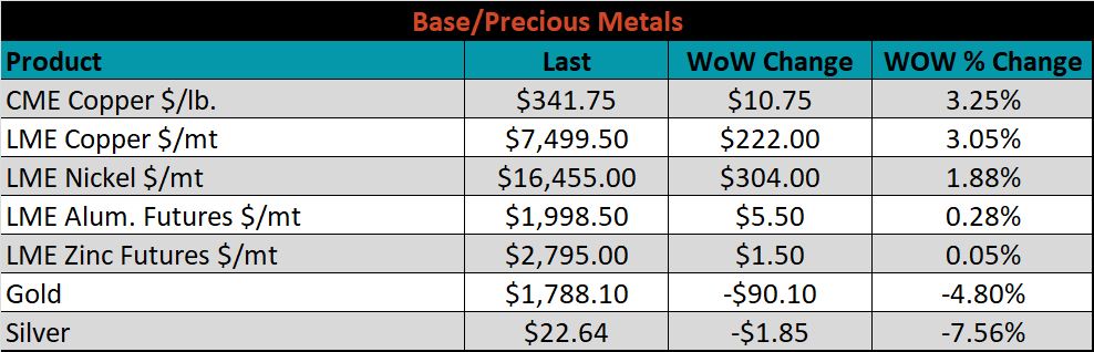 SBB Platt’s HRC, CRC and HDG pricing is below. The Midwest HRC, CRC and HDG prices were up 4.8%, 3.9% and 1%, respectively. Globally, the Turkish HRC price was up, 6.5%.