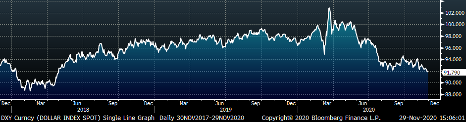 Last week, the January WTI crude oil future gained another $3.38 or 8% to $45.53/bbl. The aggregate inventory level was unchanged, while crude oil production increased to 11m bbl/day. The Baker Hughes North American rig count was up 11 rigs and the U.S. rig counts was up 10 rigs.