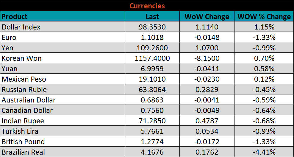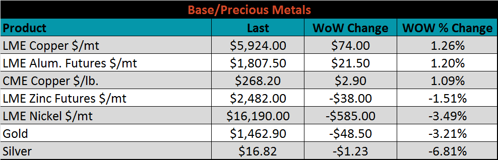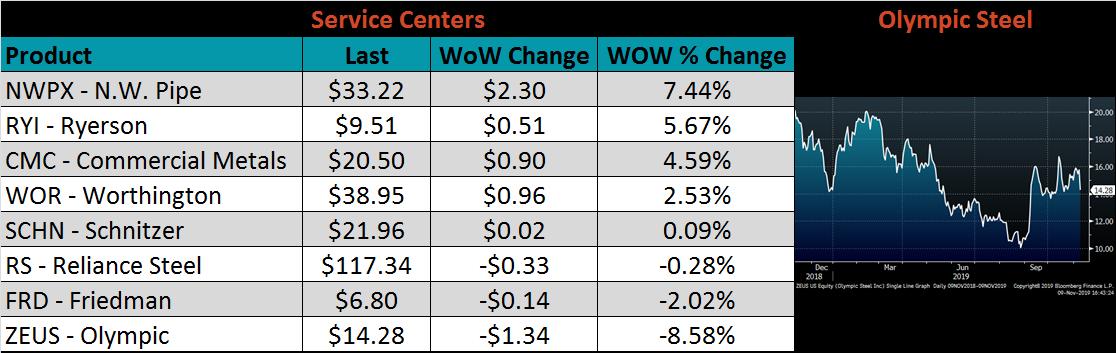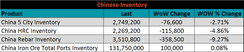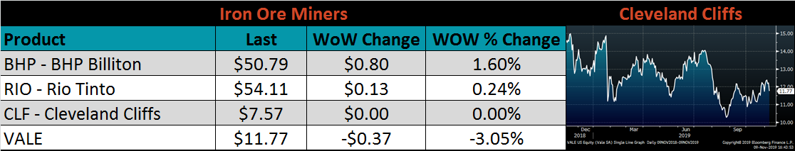 Raw material prices were mixed. Shredded scrap delivered to the Midwest was up 9.5%, while the IODEX was down another 6%.