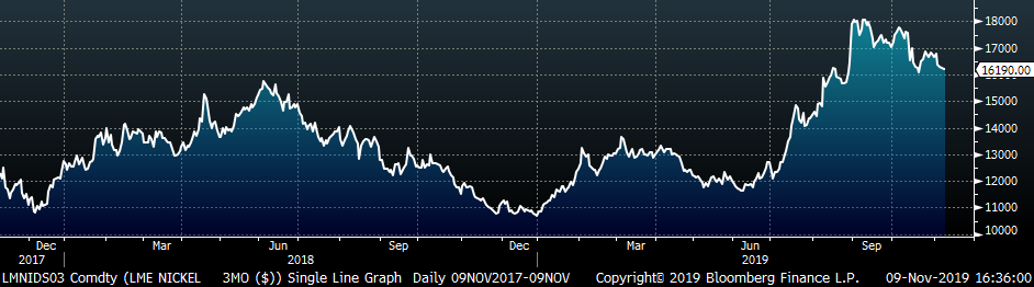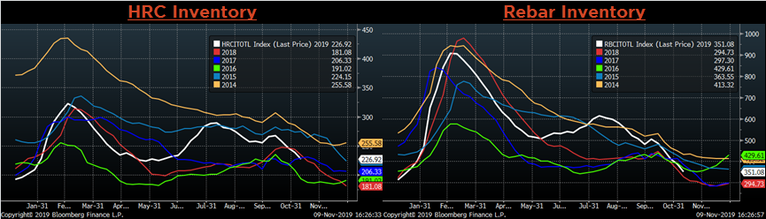 Last week mills pushed another price increase, led by Nucor raising offers $40/st. This is the second price increase announced in the last two weeks, and spot prices have stabilized from the two month slide and moved slightly higher to $500/st. As this report has discussed, these increases were expected in the market, as well as the future curve. Additionally, there are rumors of another increase announcement, which is also expected by the future curve based on current prices. The mills’ ability to capture additional increases appears likely as most December availability is gone, and they have not yet opened January order books. Lead times are extending, and currently sit at the highest levels since mid-2018. Scrap prices moved up $20 in November, providing additional support for the increases. The bottom for spot prices has been set, at least in the near-term, and prices seem poised to move higher.