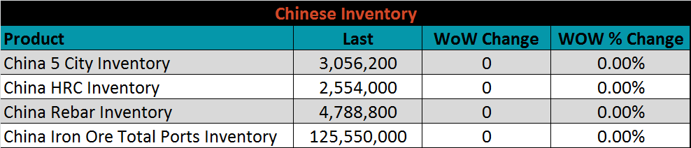 The CME Midwest HRC futures curve is below with last Friday’s settlements in white. The curve has continued to move lower across all expirations, most significantly in the front as inactivity continues to push spot prices lower.
