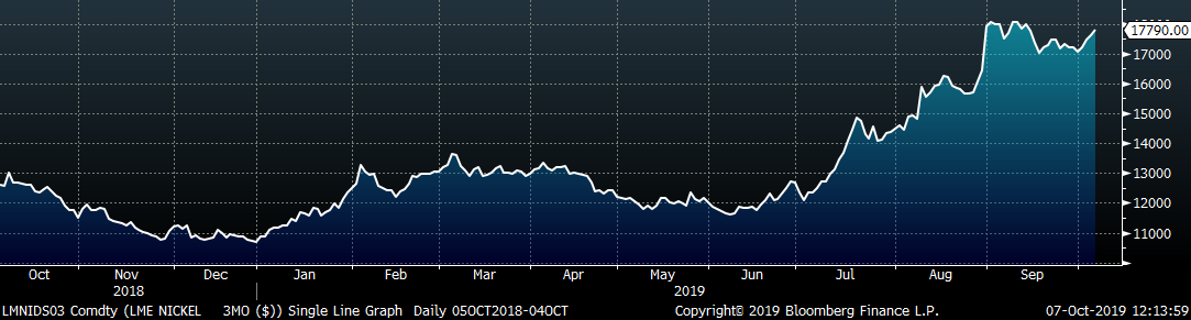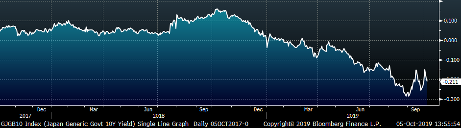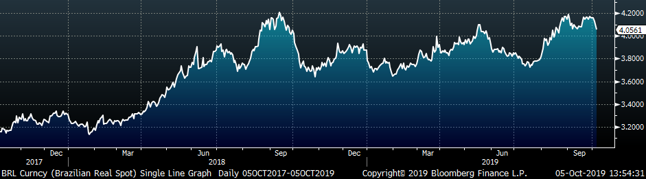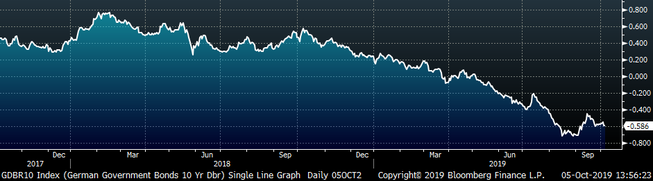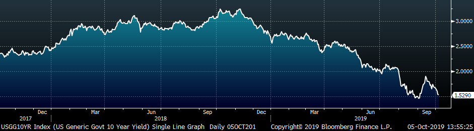 September U.S. light vehicle sales were up 220k to a 17.19m seasonally adjusted annualized rate (S.A.A.R). The white line in the second chart below compares monthly auto sales with previous years’ levels. The first 7 months of 2019 have been in line with sales of the previous 4 years, and the higher than average auto sales in August were offset by the lower reading in September. The UAW strike affecting GM may continue to pressure sales going forward. The final chart shows the historical relationship between unemployment and auto sales. We have inverted the unemployment rate to show that declining unemployment typically leads to increasing auto sales.