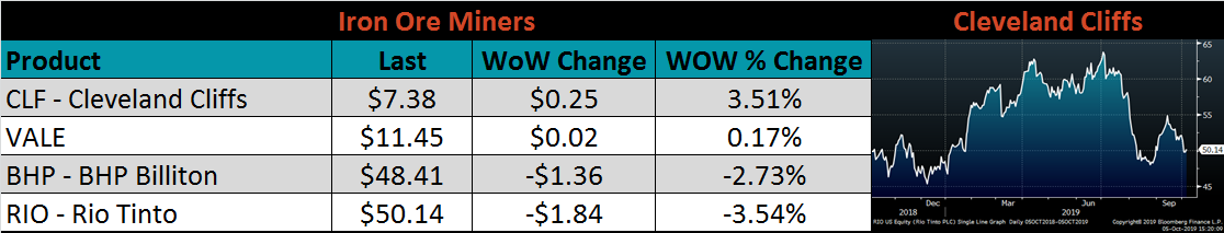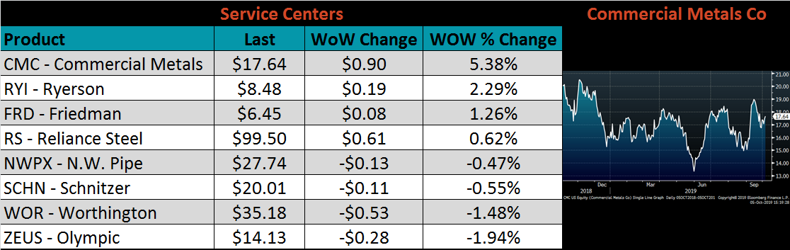 Below is the Midwest HRC price vs. each listed country’s export price using pricing from SBB Platts. We have adjusted each export price to include any tariff or transportation cost to get a comparable delivered price. Turkey’s price has been the only referenced price declining, therefore increasing the differential to the Midwest price. However, with a 25% tariff still in place, importing from Turkey continues to be unattractive.