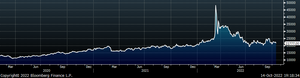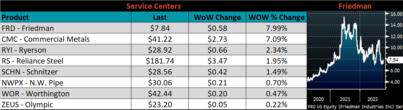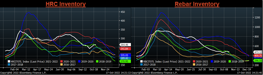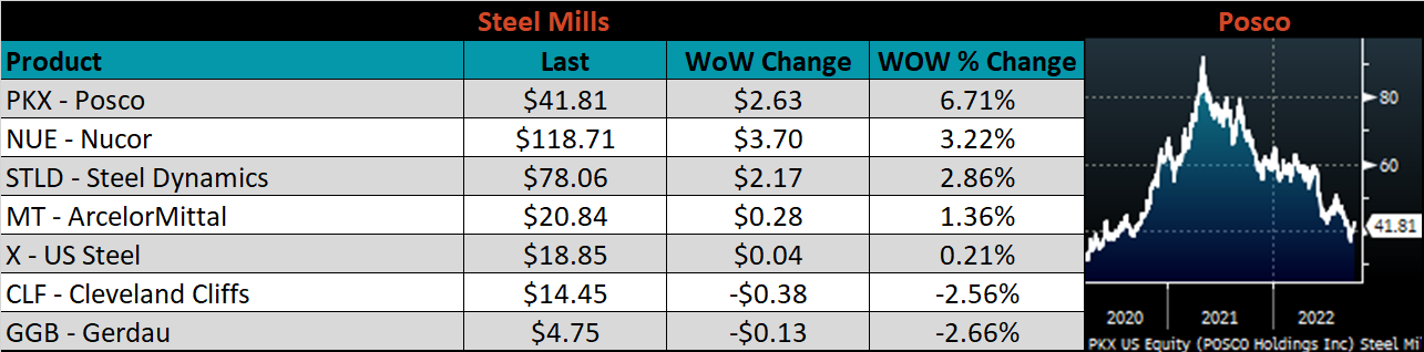 The CME Midwest HRC futures curve is below, with last Friday’s settlements in white. The curve continues to be under significant pressure with the 4Q22 and 1Q23 both trading below current spot prices.