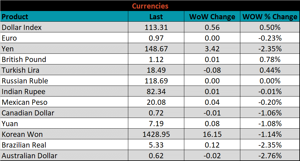 Below is the Midwest HRC price vs. each listed country’s export price using pricing from SBB Platts. We have adjusted each export price to include any tariff or transportation cost to get a comparable delivered price. Differentials increased for China, Korea and Europe but fell for Turkey.