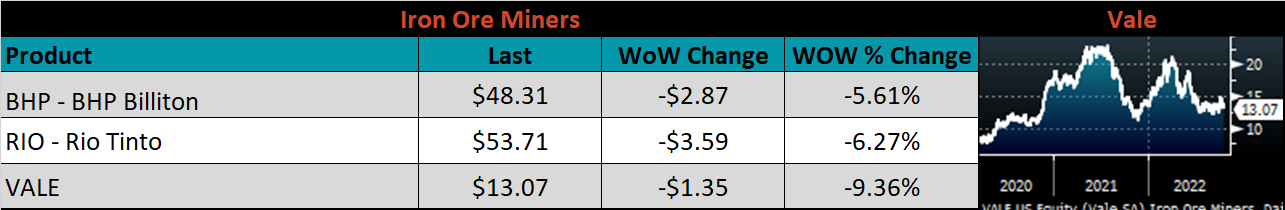 The 2nd month ferrous futures were mostly lower, with Midwest busheling down 5.1%, while Aussie coking coal continues to buck this trend, up another 3.6%.
