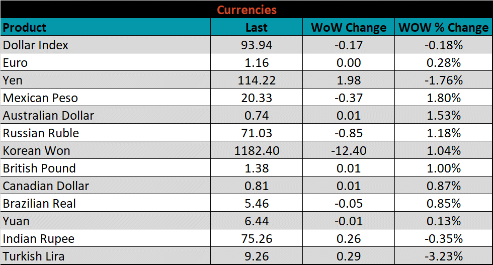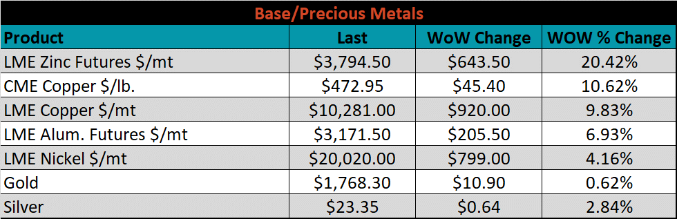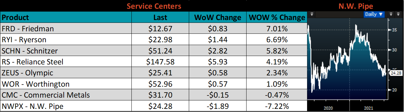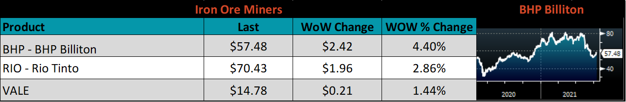 SBB Platt’s CRC, HDG and HRC pricing is below. The Midwest CRC and HDG prices were unchanged, while the HRC price was down 2.6%. Outside of the U.S., the Turkish HRC export price was up 6%.