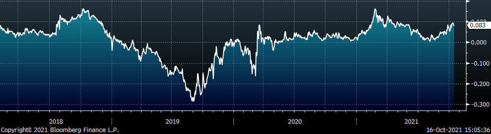Below is the iron ore future curve with Friday’s settlements in orange, and the prior week’s settlements in green. Last week, the entire curve reversed the 3 week trend and shifted lower. This also reversed the recent flatenning of the curve, as later expirations fell far more significantly than anything in the next 3-6 months.