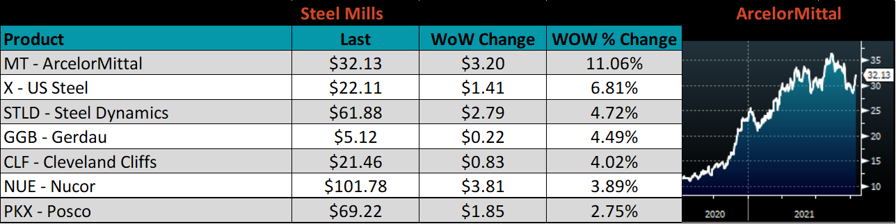 The CME Midwest HRC futures curve is below with last Friday’s settlements in white. Last week, the curve was mixed, but most expirations were slightly higher, led by January up $33, while June of next year was $20 lower.