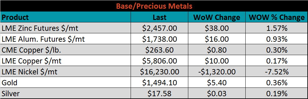 SBB Platt’s HRC, CRC and HDG pricing is below. The Midwest HRC, HDG and CRC prices were down 4.7%, 3.1% and 1.6%, respectively, while global steel export prices remained relatively flat.
