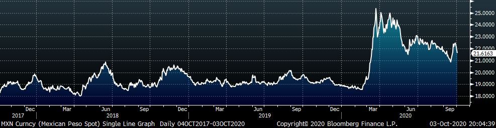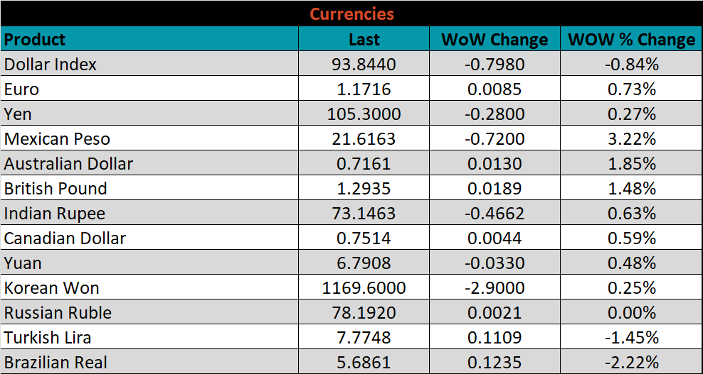 The U.S. dollar was down 0.80 to 93.84, while the Mexican peso rose 3.2%.