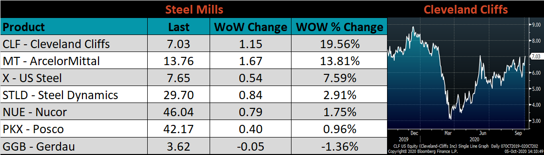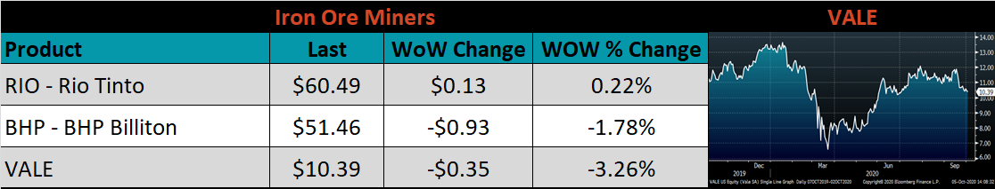 Below are inventory levels for Chinese finished steel products and iron ore. Last week, the HRC and rebar inventory levels were lower, iron ore inventory levels increased again. Last week, China entered its weeklong Golden Week holiday, leaving multiple markets closed and/or illiquid.