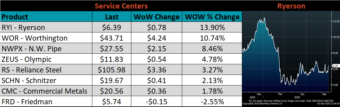 Raw material prices were mostly lower. Iron ore was up 6.1%, while East Coast shredded scrap was down 3.6%.