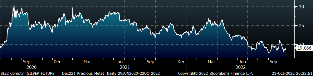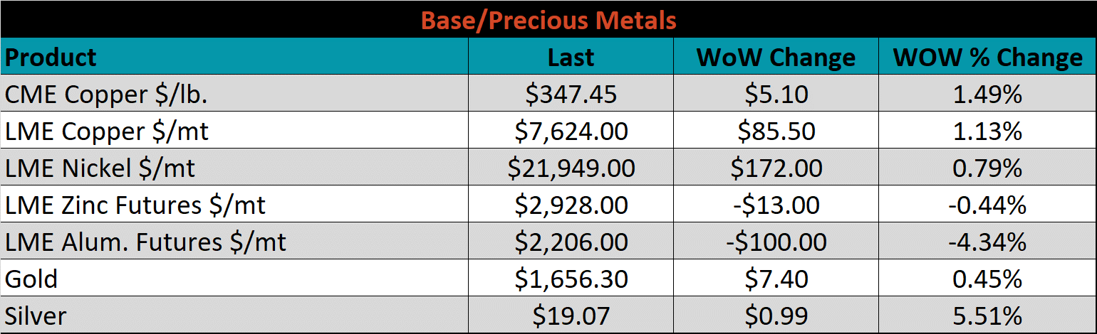 Base and precious metal futures were mixed last week, with silver up 5.5% and LME aluminum down 4.3%