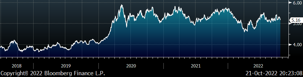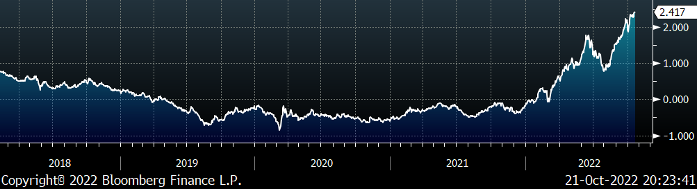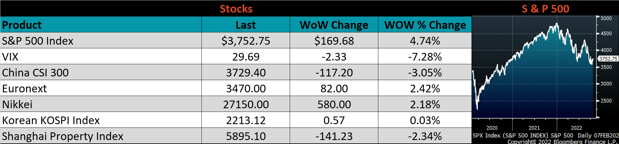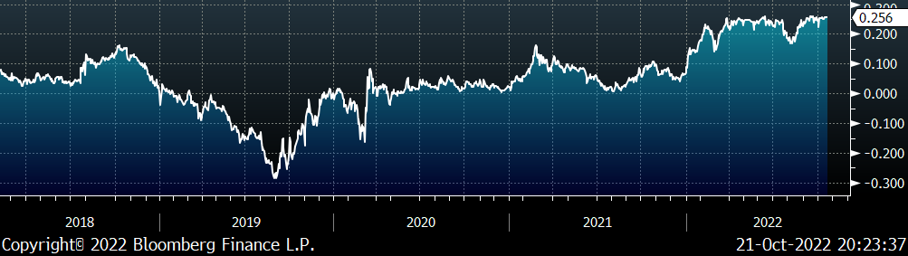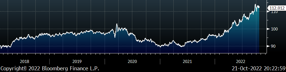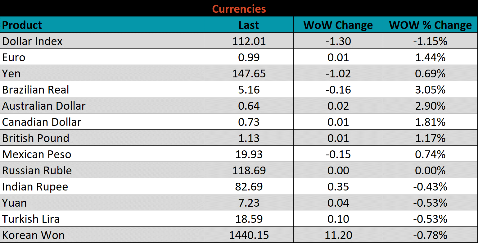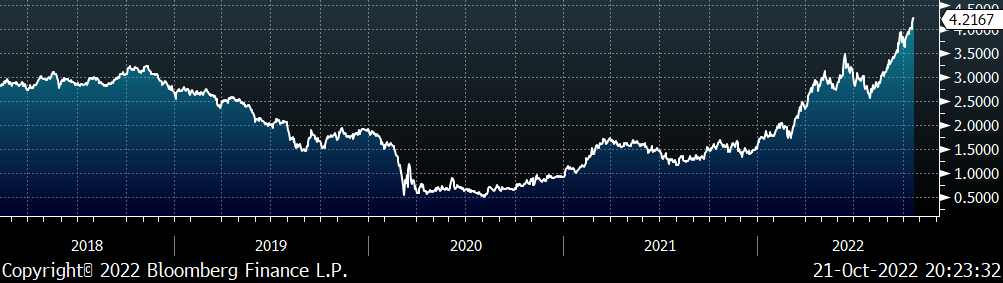 The U.S. 10-year yield was up another 20 bps, closing the week at 4.22%. The German 10-year yield was up another 7 bps to 2.42%, and the Japanese 10-year yield was up 1 bps to 0.26%.