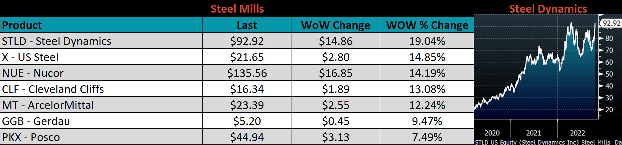 Below is the Midwest HRC price vs. each listed country’s export price using pricing from SBB Platts. We have adjusted each export price to include any tariff or transportation cost to get a comparable delivered price. Differentials increased for China, Korea, and Turkey, suggesting that there is more global downward pressure which the U.S. domestic price has not yet realized.