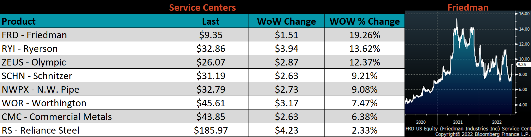 Global flat rolled indexes were mostly lower again, but Black Sea and Antwerp HRC were both up sharply, 10.2% and 7.9%, respectively. U.S. domestic tandem products recorded some of the steepest declines last week as their differential to HRC continues to revert to more historically normal levels.