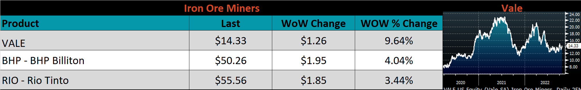 Below are inventory levels for Chinese finished steel products and iron ore. HRC, Rebar and the 5-city inventories were all lower and remain withing seasonal norms. Iron ore port inventories increased slightly but is currently on the low end of what is seasonally expected.