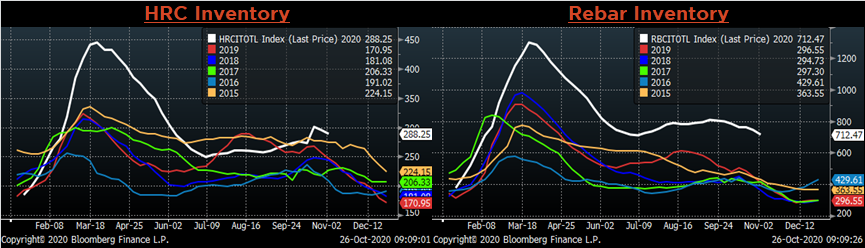 More of the same this week, as spot prices resume their upward momentum in one of the fastest price rallies over the past decade. Currently, mills are offering around $680/st for new HRC inquiries, with lead times extending through the end of the year. Most mill are holding off on quoting January tons, with the belief that waiting to open order books in a rising price environment will be lucrative. The risk for mills is that prices move too high, deterring buyers from placing orders once the January order book opens. However, we do not believe this is likely due to the structural deficit that has developed in the spot market over the past few months. This week, we will analyze this deficit and discuss possible ways in which may be resolved.