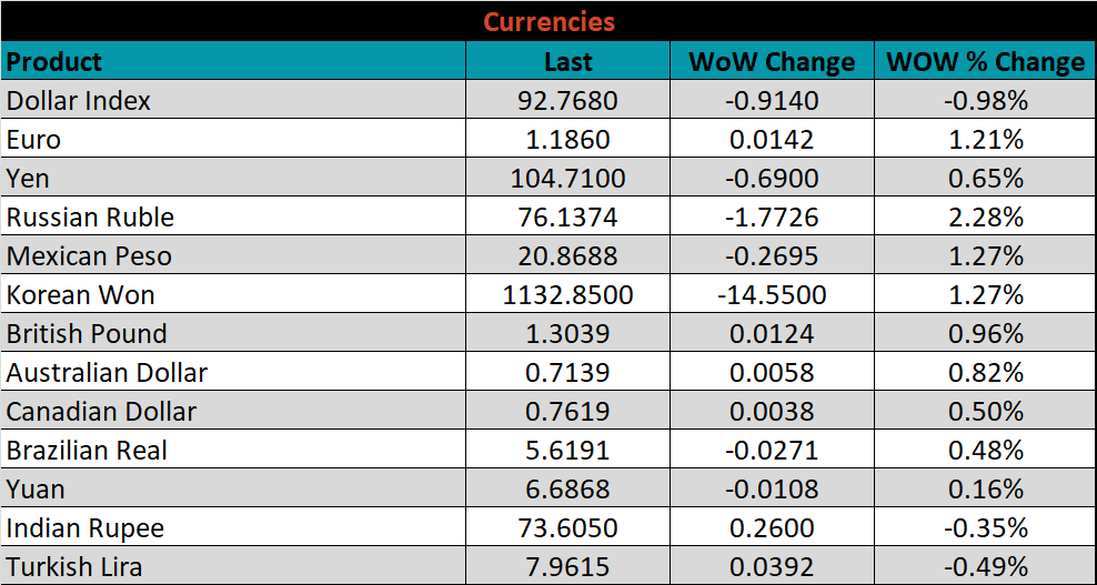 Below is the Midwest HRC price vs. each listed country’s export price using pricing from SBB Platts. We have adjusted each export price to include any tariff or transportation cost to get a comparable delivered price. The differentials for all watched countries increased again last week, as the U.S. price outpaced all global prices.