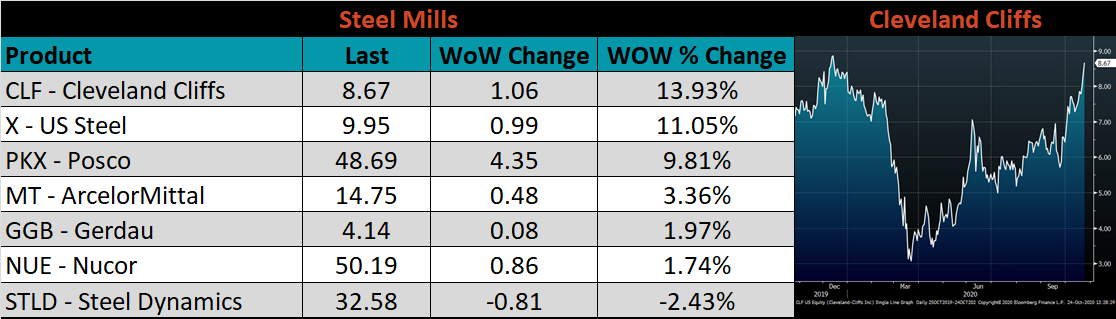 November ferrous futures were mixed. Midwest HRC gained 3.3%, while Aussie coking coal fell another 4.5%. The November Aussie coking coal future is down nearly 25% over the past month.