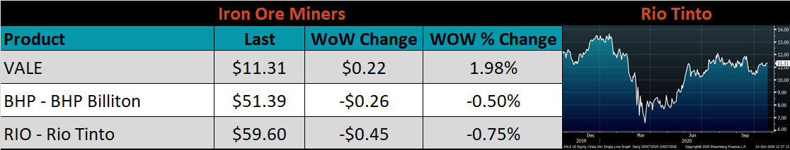 Raw material prices were mixed. East Coast shredded was up 2%, while Aussie coking coal was down another 11.2%.