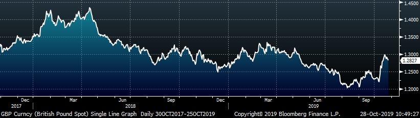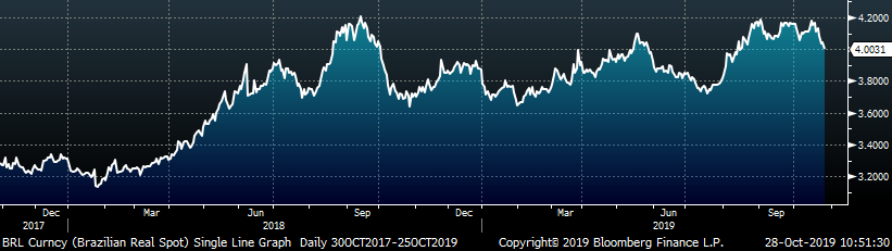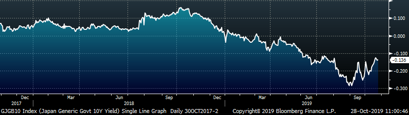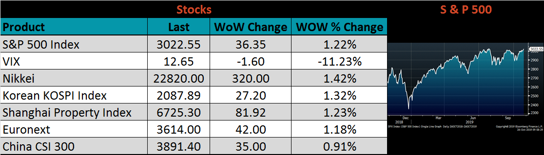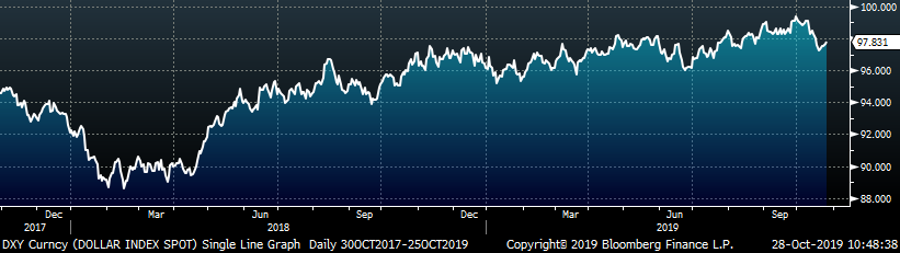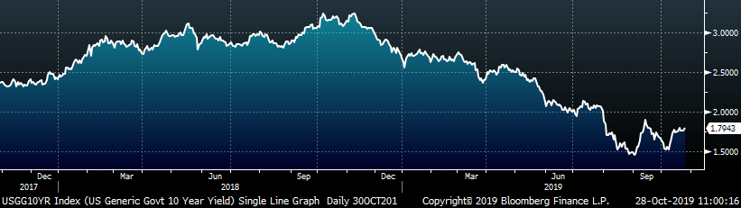 The remaining significant economic data is to the right. This week, the preliminary September Durable Goods Report came in below expectations of minus 0.7% down to minus 1.1%. This is largely because of the uncertainty around the UAW – GM strike, but new orders were still slightly lower MoM at minus 0.3% after removing transportation. Additionally, the October Richmond Fed Manufacturing Index printed 17 points higher than September at 8, well above the expectation of -7. The October Kansas City Fed Manufacturing Index was down 1 point from September and matching the expectation of -3.