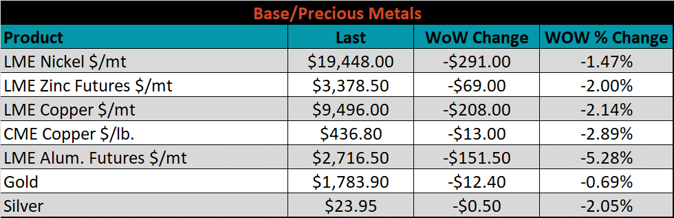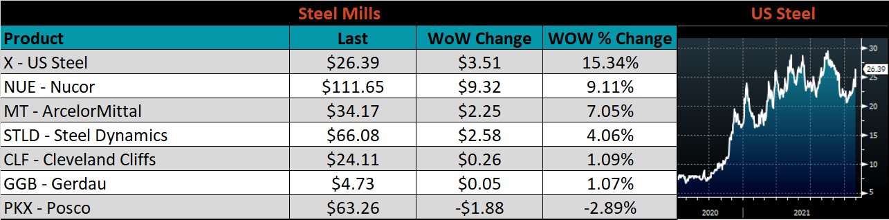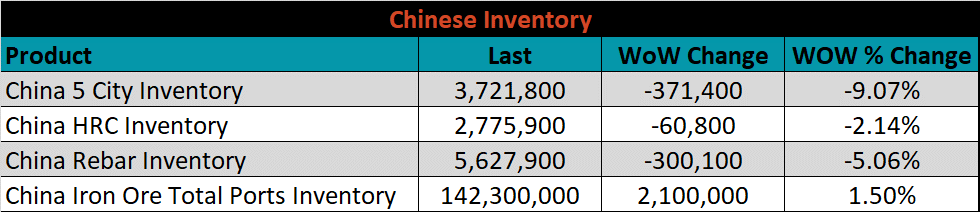 Below is the Midwest HRC price vs. each listed country’s export price using pricing from SBB Platts. We have adjusted each export price to include any tariff or transportation cost to get a comparable delivered price. The Chinese HRC differential was the only one that increased this week, as their prices decreased more significantly than the U.S. domestic price.