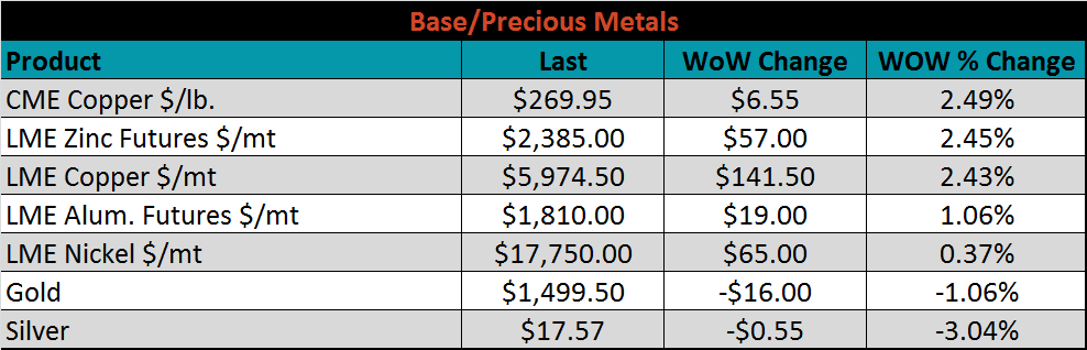 Raw material prices were mixed. The IODEX and SGX iron ore futures were each up 12.5%, while shredded FOB East Coast was down 12.4%.