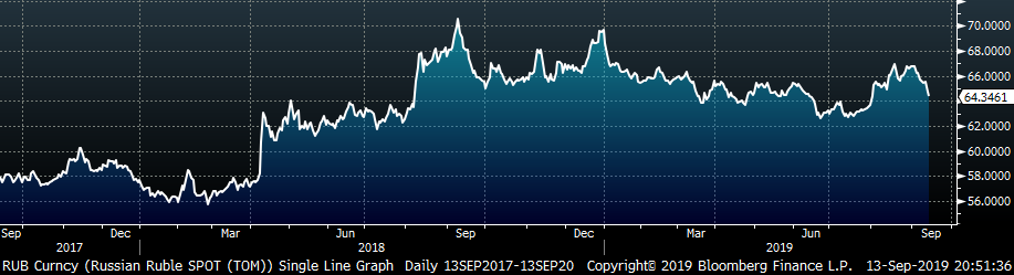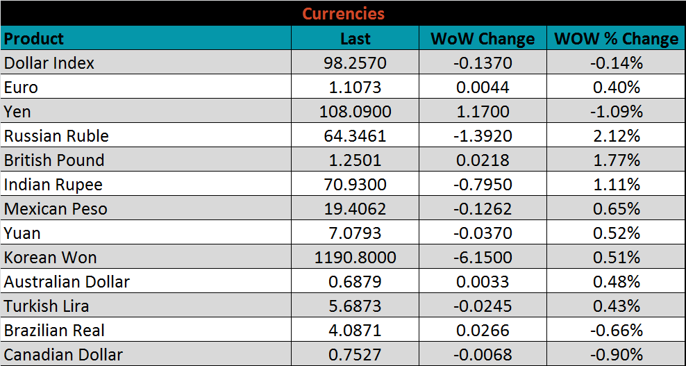The U.S. dollar lost 0.14 to 98.39 while the ruble and pound were each up, 2.1% and 1.8%, respectively.