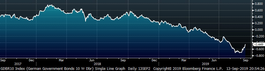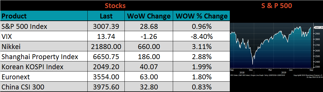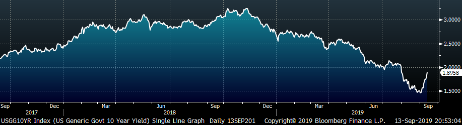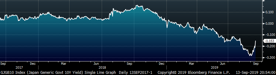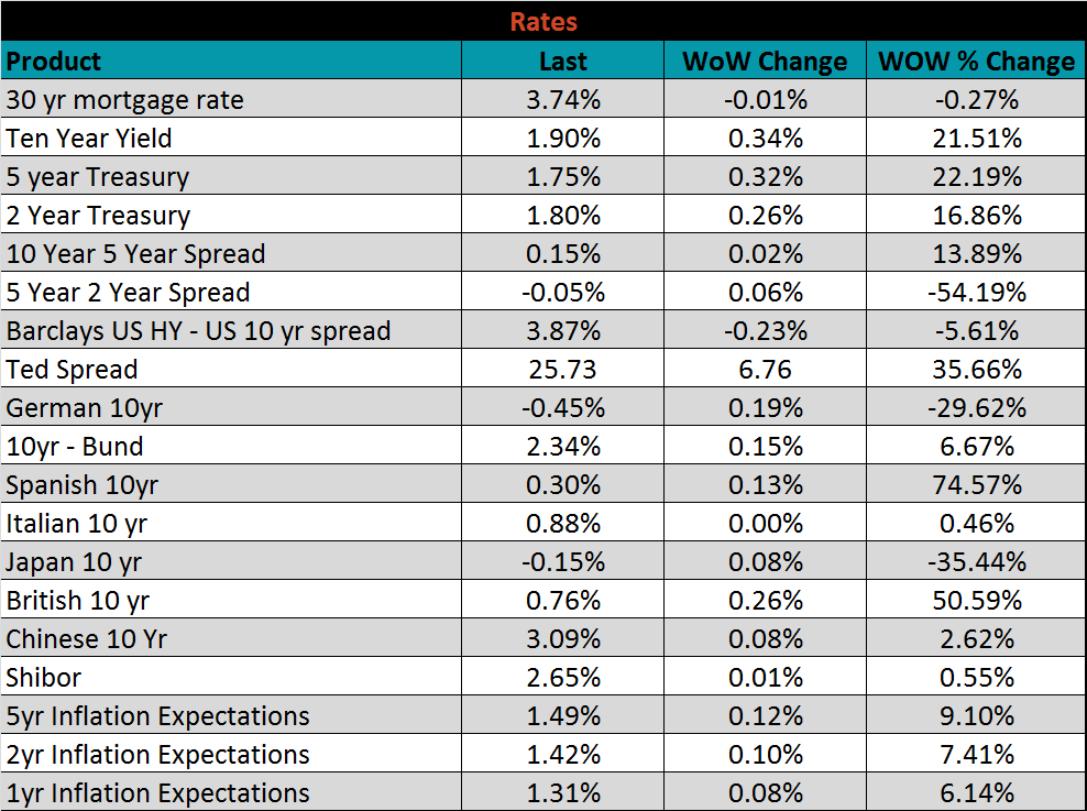 The U.S. 10-year yield was up 34 bps, closing the week at 1.90%. The German 10-year yield was up 19 bps to minus 0.45% and the Japanese 10-year yield was up 8 bps to minus 0.15%.
