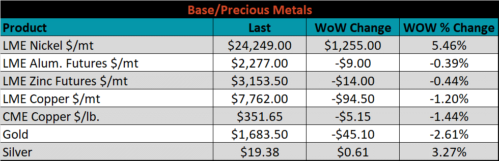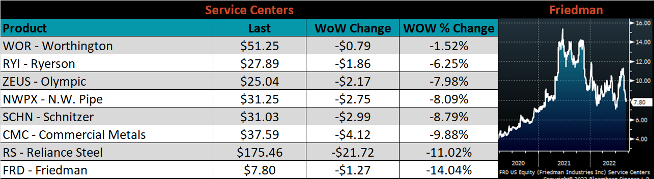 SBB Platt’s HRC, CRC, and HDG pricing is below. The Midwest CRC, HRC, & HDG prices were all down 2.6%, 2.4%, and 1.7%.