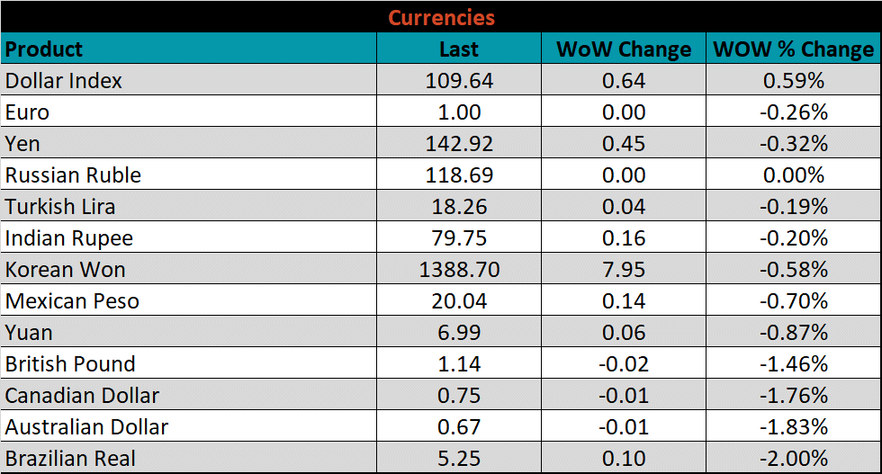 Below is the Midwest HRC price vs. each listed country’s export price using pricing from SBB Platts. We have adjusted each export price to include any tariff or transportation cost to get a comparable delivered price. Differentials decreased for Russian, China, Brazil, & Korea, but they ticked slightly higher for Northern Europe and Turkey.
