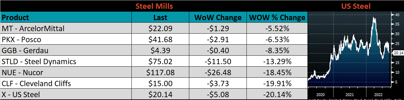 The CME Midwest HRC futures curve is below, with last Friday’s settlements in white. The entire curve shifted lower last week, with Nov.22-May.23 futures settling at its lowest levels in the last month.