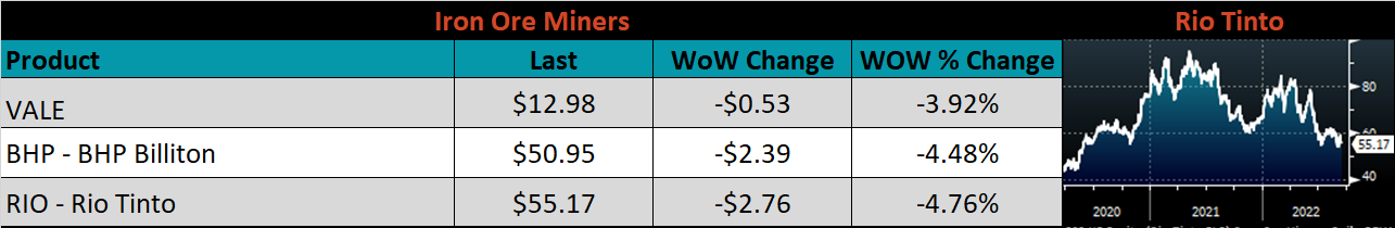 Below is the iron ore future curve with Friday’s settlements in orange, and the prior week’s settlements in green. Last week, the entire curve shifted lower, most significantly in the front of the curve.