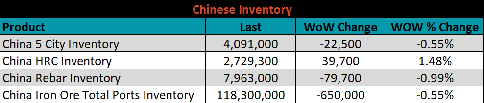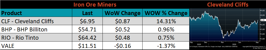Raw material prices were mixed. Aussie coking coal was up 12.7%, while the IODEX Index was down 3%.