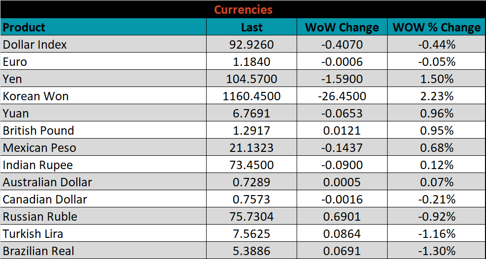 Below is the iron ore future curve with Friday’s settlements in orange, and the prior week’s settlements in green. Last week, the curve was slightly lower, more so in the back.
