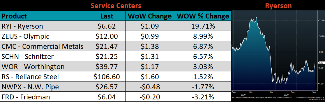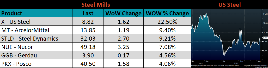 SBB Platt’s HRC, CRC and HDG pricing is below. The Midwest HRC, CRC and HDG prices were up, 6.5%, 5.8% and 1.7%, respectively. Globally, the Northern European HRC and CRC prices were up 2.7% and 1.7%, respectively.