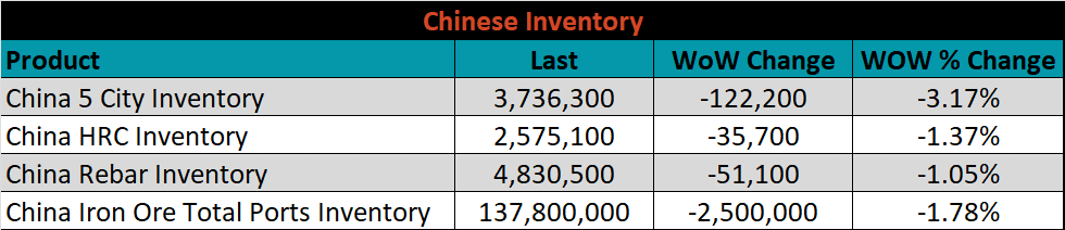 Below is the Midwest HRC price vs. each listed country’s export price using pricing from SBB Platts. We have adjusted each export price to include any tariff or transportation cost to get a comparable delivered price. Differentials decreased for all the watched countries, apart from Northern Europe, which was weaker than U.S. domestic HRC for the 3rd week in a row.
