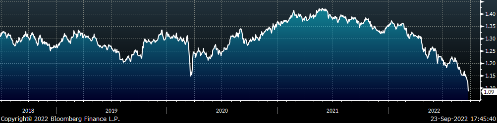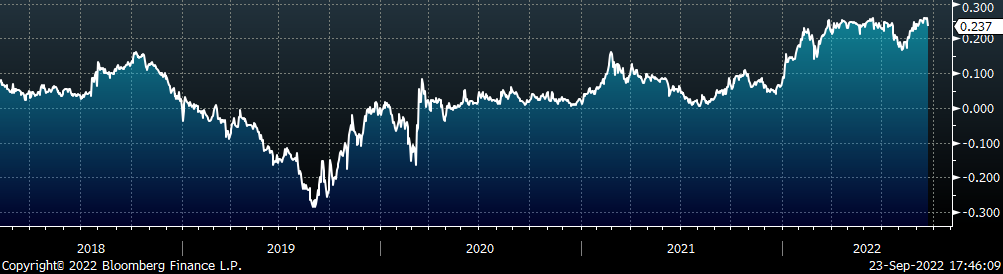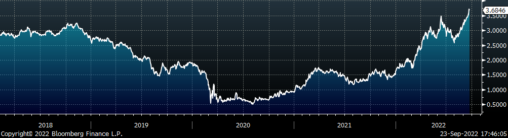 While the FFTR and US Dollar have risen at the sharpest pace in the last 30 years due to aggressive Fed policy, they are still below the peak levels observed over that time. With only two FOMC meetings left on the schedule for the year, the dot plots project an additional 75 basis point hike in the early November meeting and an additional 50 basis point hike in mid-December. This would put the target rate at 4.5% by the end of the year. If inflation persists longer than anticipated, there is runway for further increases based on historical levels.