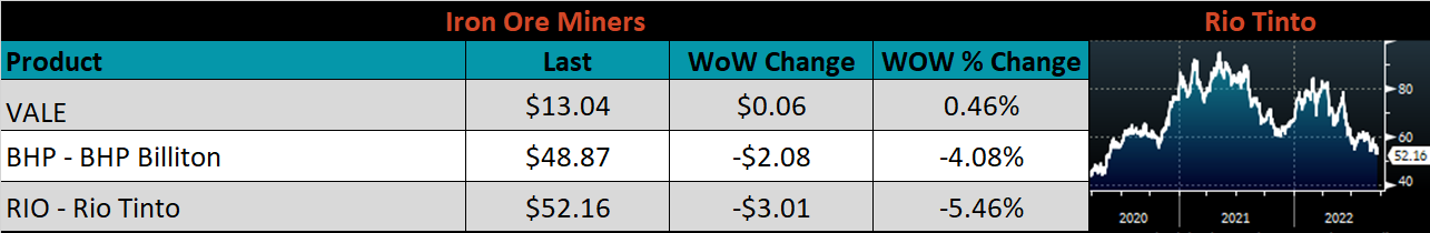 Below is the iron ore future curve with Friday’s settlements in orange, and the prior week’s settlements in green. Last week, the entire curve shifted slightly lower, most significantly in the back of the curve.