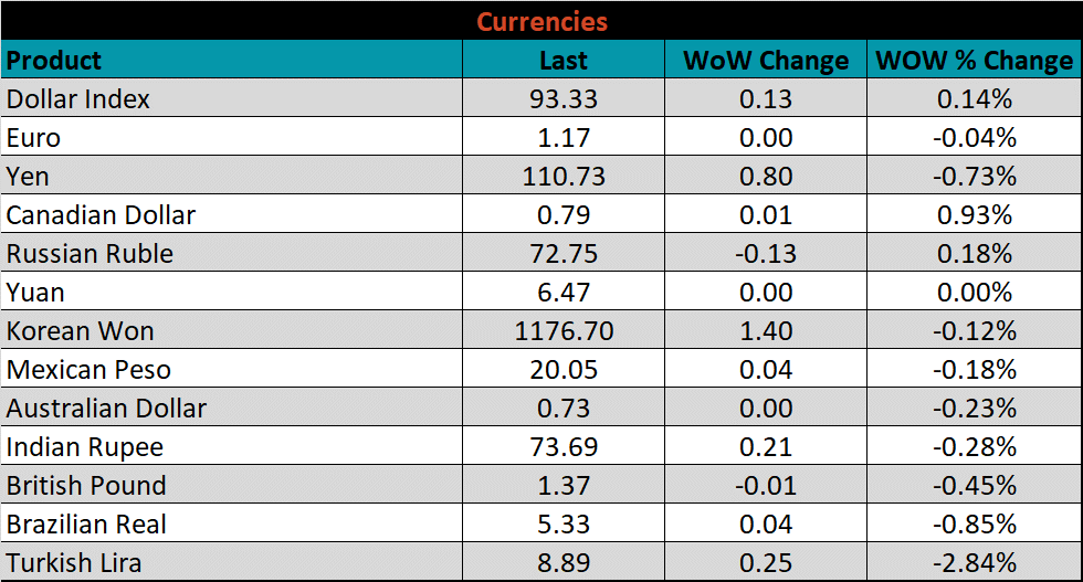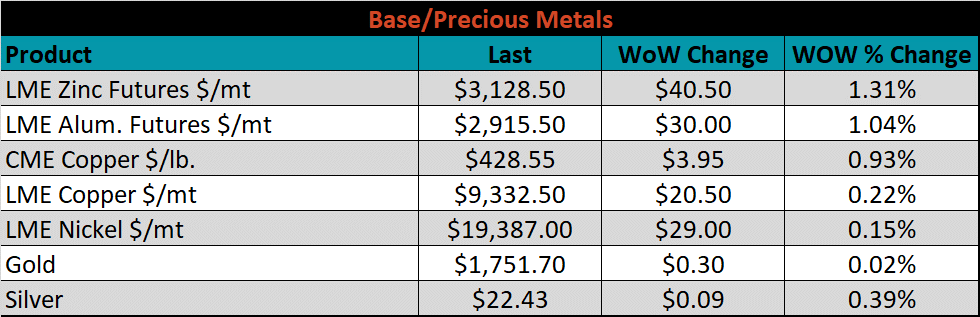 SBB Platt’s HRC, CRC and HDG pricing is below. The Midwest CRC, HRC, & HDG prices were up by 1.6%, 0.3%, and 0.1%, respectively. Outside of the U.S., the Southern European HRC price was down 3.6%.