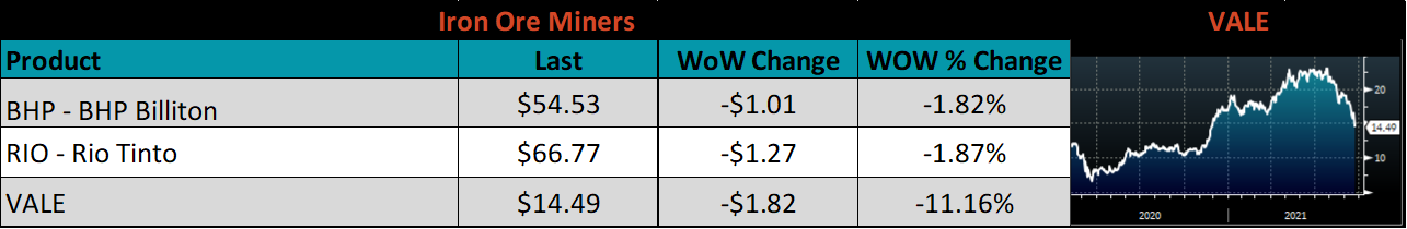 Raw material prices were mixed. Iron ore futures were up 15%, while East Coast shredded lost 2.5%.