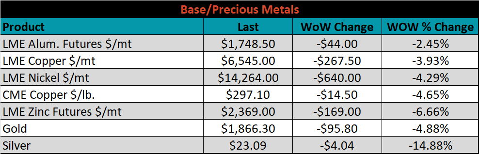 SBB Platt’s HRC, CRC and HDG pricing is below. The Midwest CRC, HDG and HRC prices were up, 1.2%, 0.8% and 0.1%, respectively. Globally, the Chinese export HRC price was down 1.4%.
