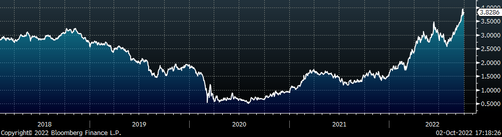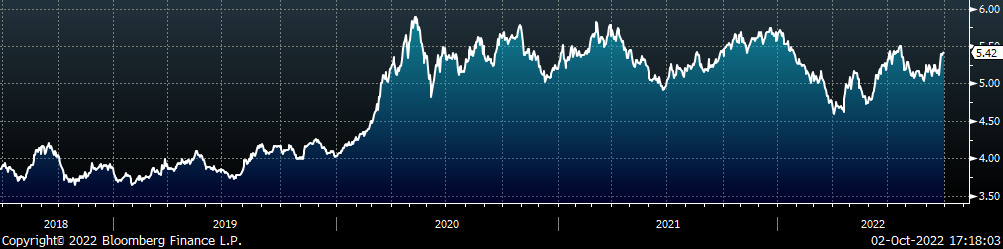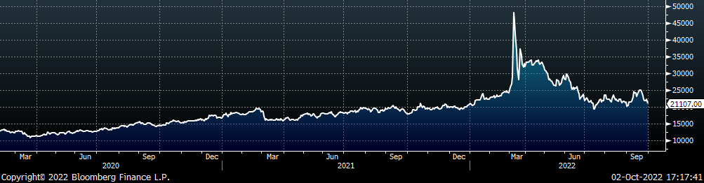 Since peaking in November of last year, import arrivals have been trending lower but the moving average has been surprisingly stable around 1M tons per month, well above normal levels in the post-232 era. While the data is still preliminary, it appears that steel sheet imports in September will fall to the lowest level since March 2021. Furthermore, the chart below shows the U.S. domestic capacity utilization (AISI), which is now at the lowest level since the first week of January 2021.